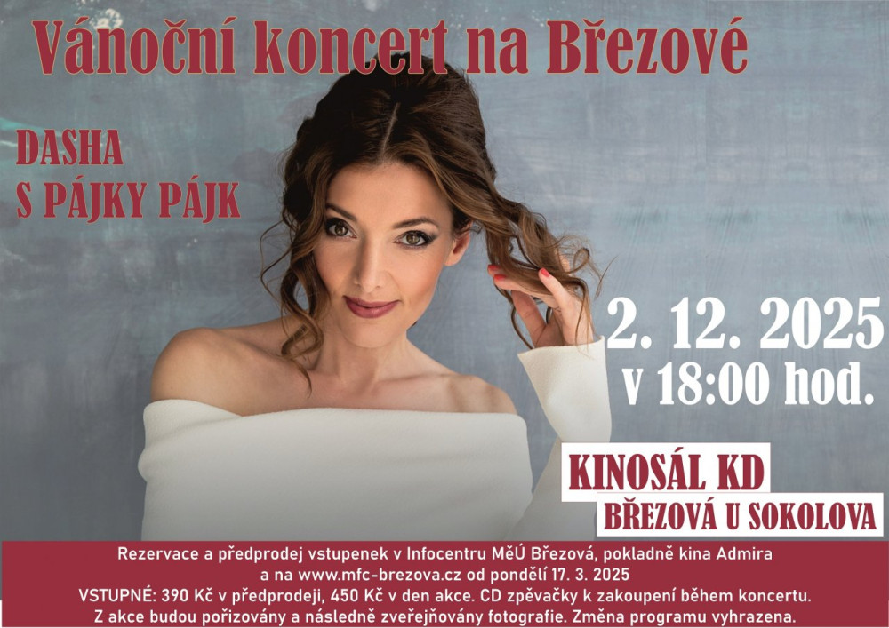 Město Březová a Kulturní dům Březová zvou na tradiční VÁNOČNÍ KONCERT, který se uskuteční v úterý 2.12.2025 v kinosále Kulturního domu Březová. Začátek programu je plánován na 18:00 hod. Během večera zazní vánoční či sváteční tematické písně. Na letošním koncertu vystoupí zpěvačka Dasha s Pájky Pájk . Vstupné činí 390 Kč v předprodeji, 450 Kč na místě. Předprodej zahájen 17. 3. 2025.