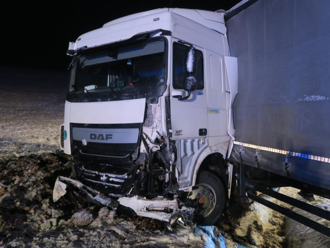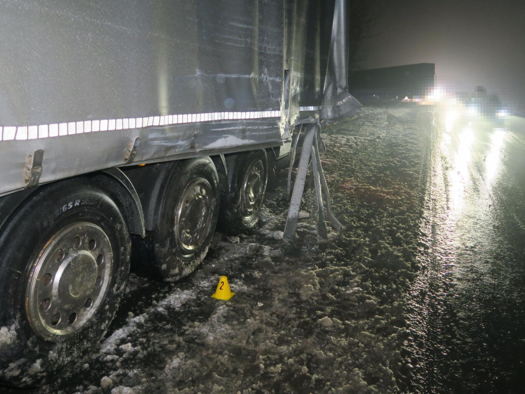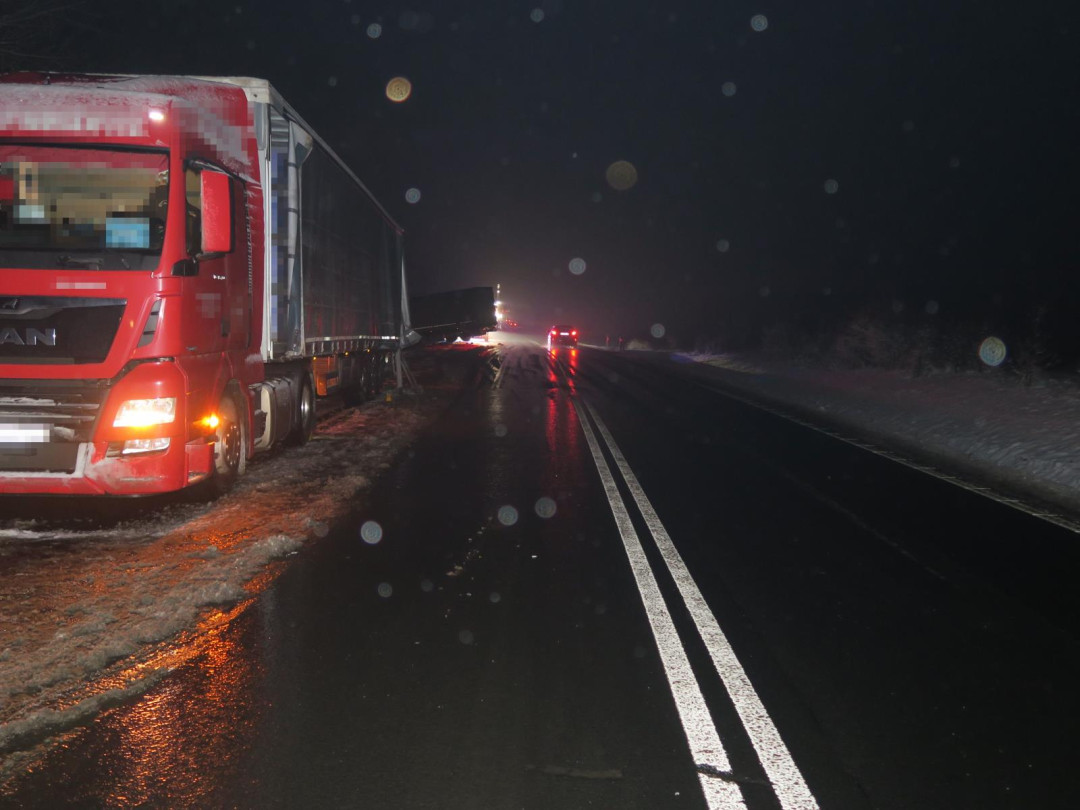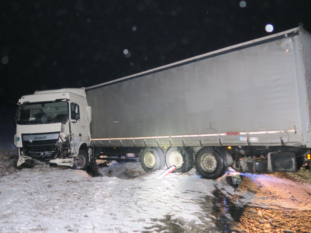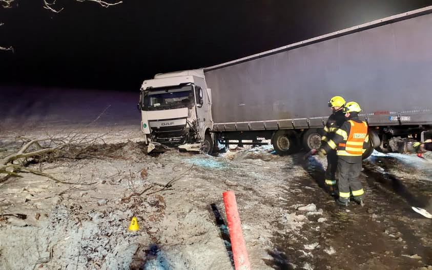 Kamion se na kluzké vozovce utrhl, naboural nákladní vozidlo stojící v protisměru a pak vyletěl ze silnice