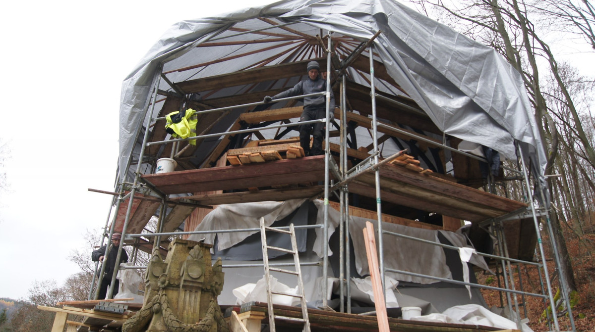 Obnova zdobné kopule pramenní síně Ottova pavilonu na snímku z roku 2024. Foto: Se svolením Lázně Kyselka - obecně prospěšná společnost