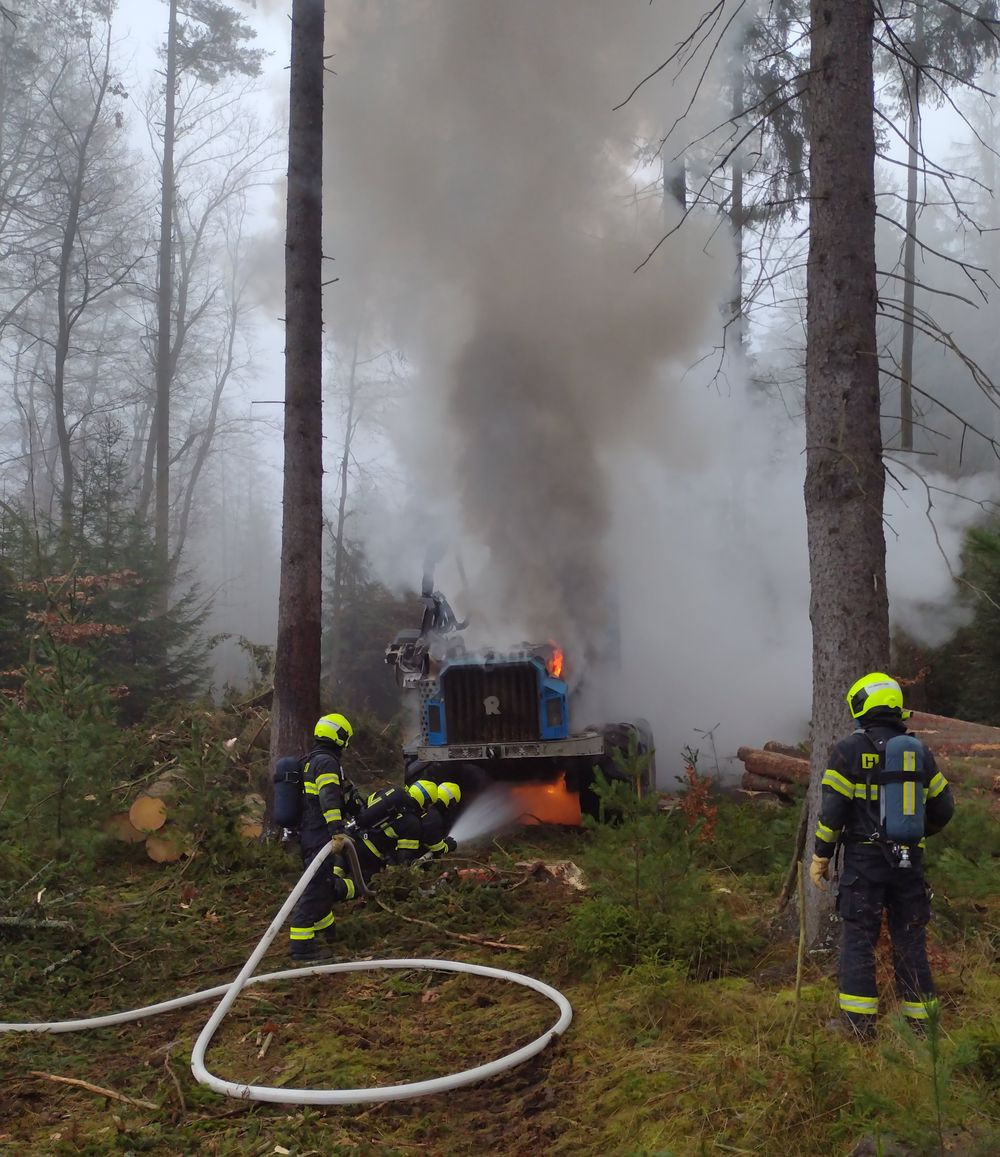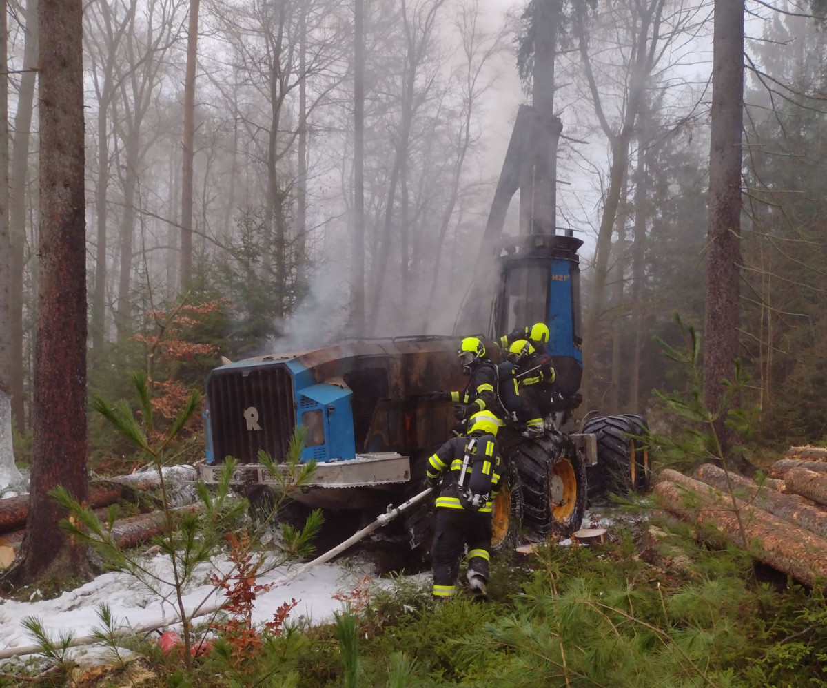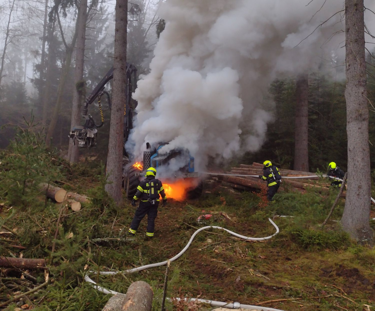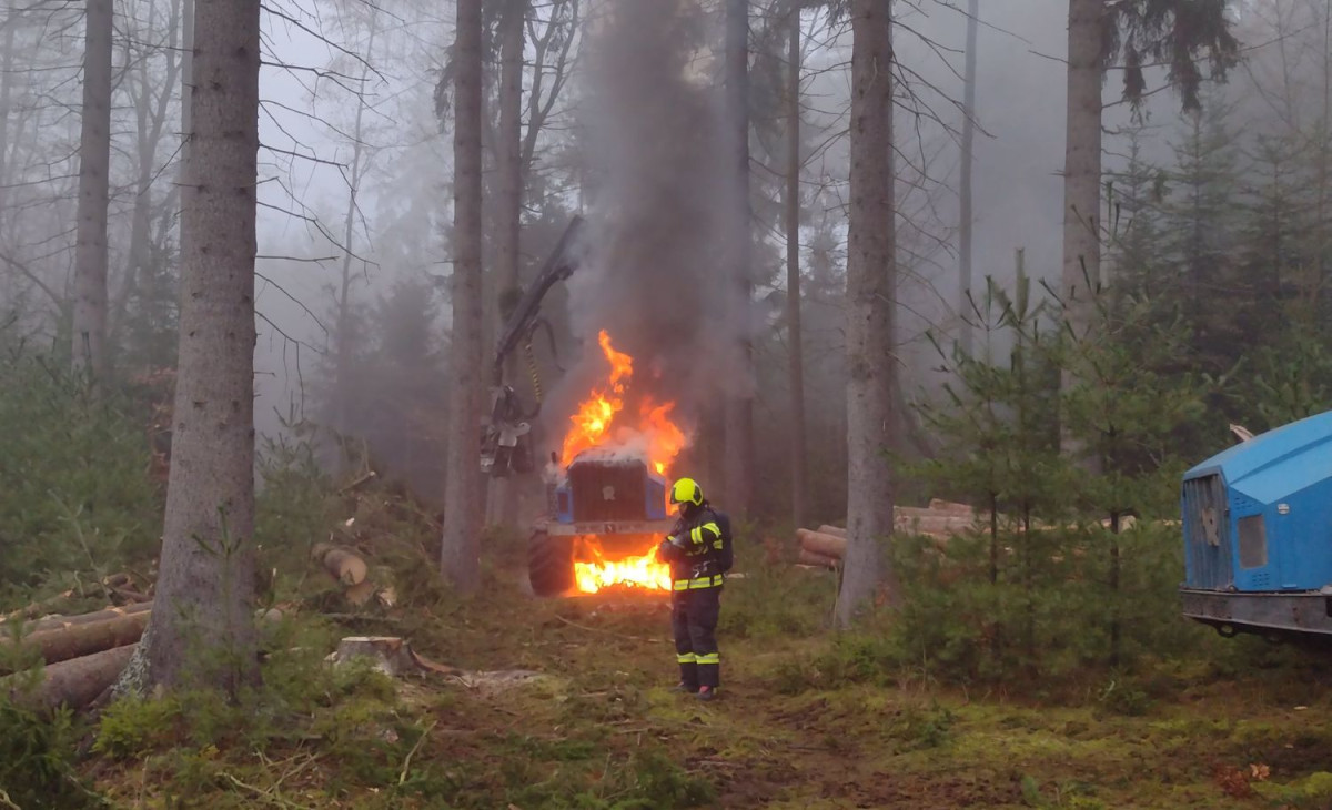 FOTO: Hasiče zaměstnával požár stroje na těžbu dřeva, škoda má být deset milionů