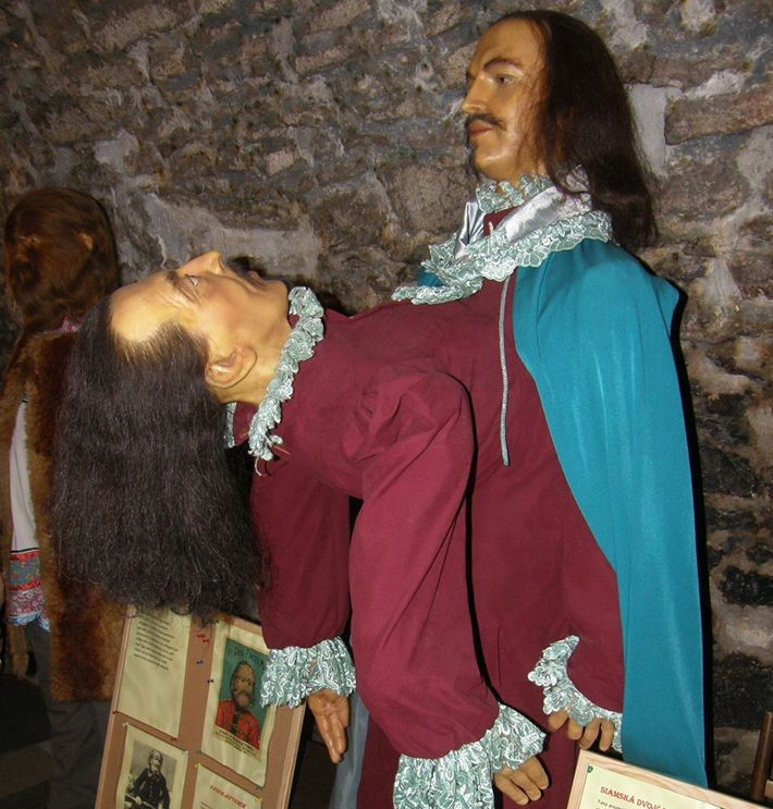 Jedním z exponátů jsou i siamská dvojčata původem z Itálie v 17. století procestovala celou Evropu