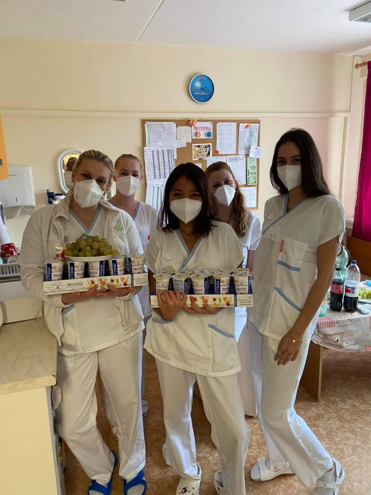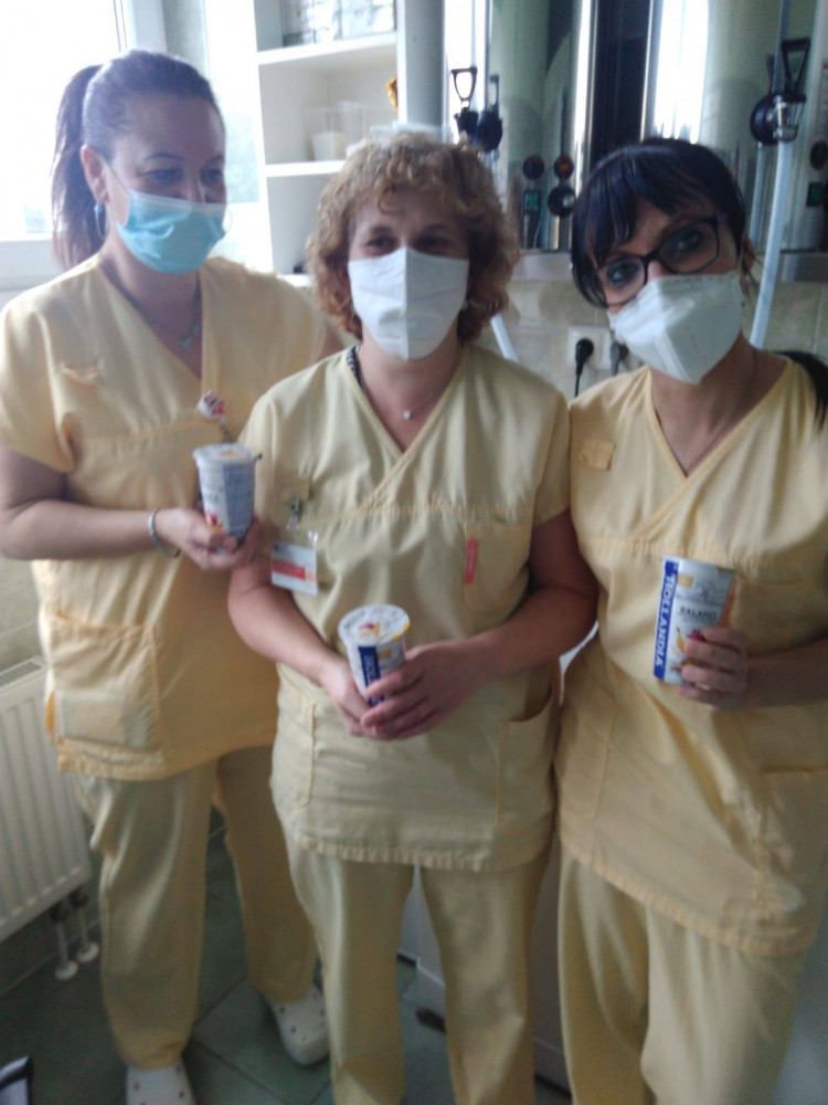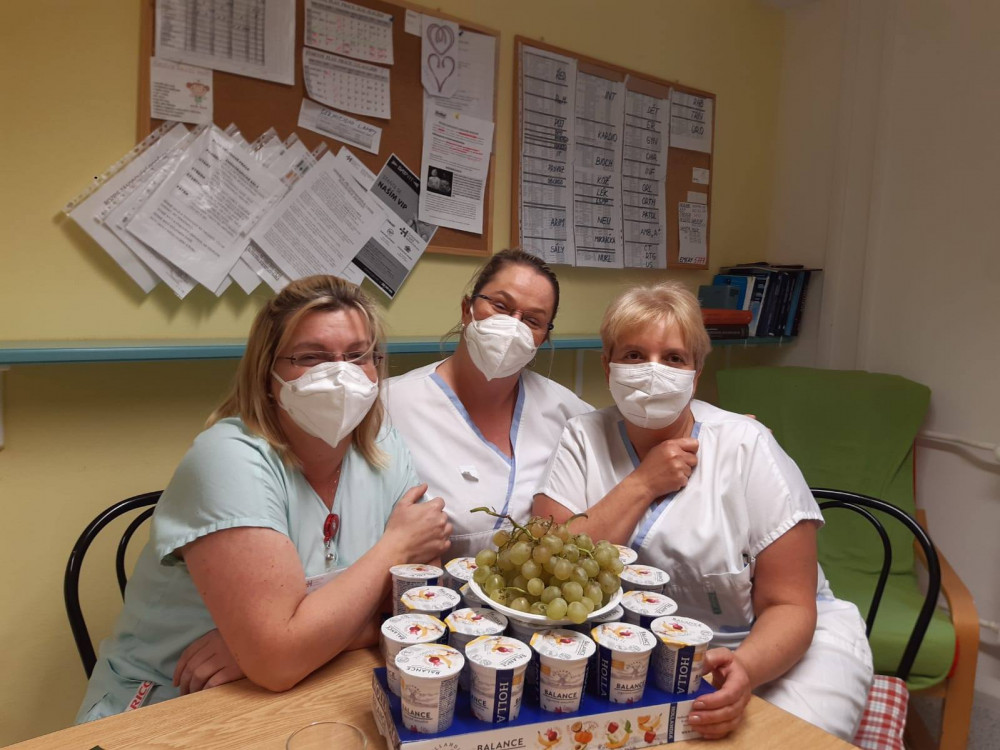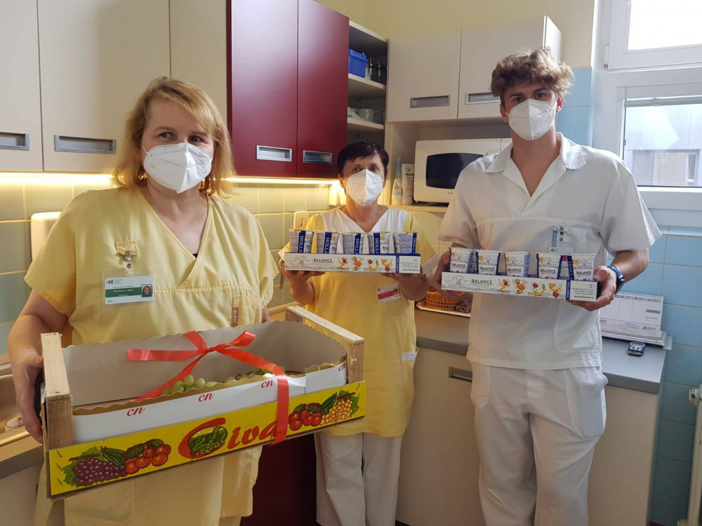 Dobrovolníci přijeli poděkovat karlovarským zdravotníkům, přivezli ovoce, jogurty, kávu a dopis
