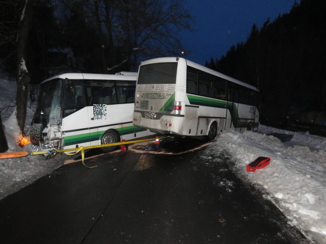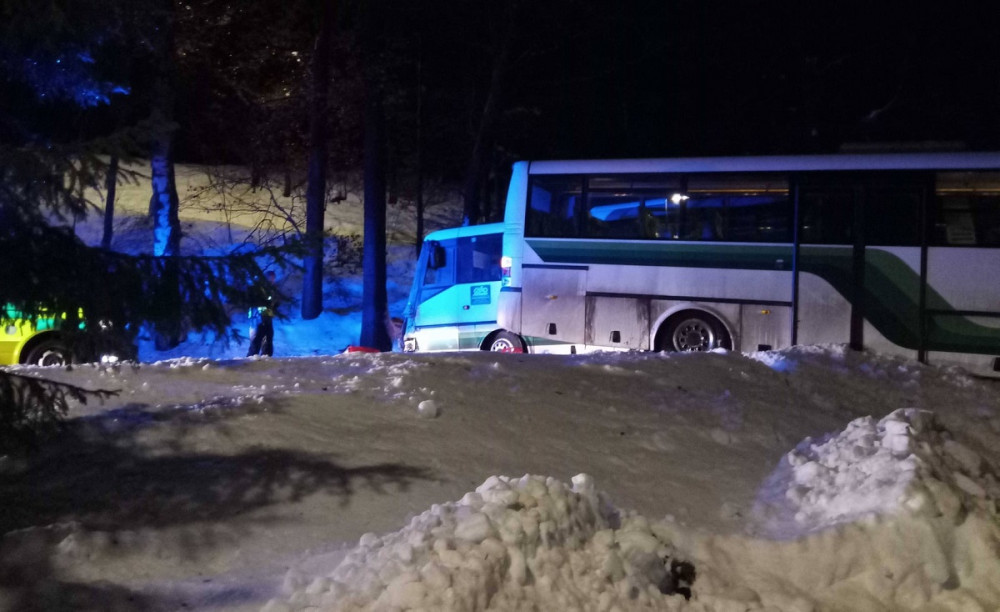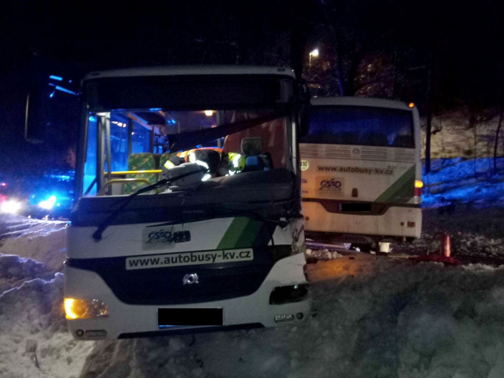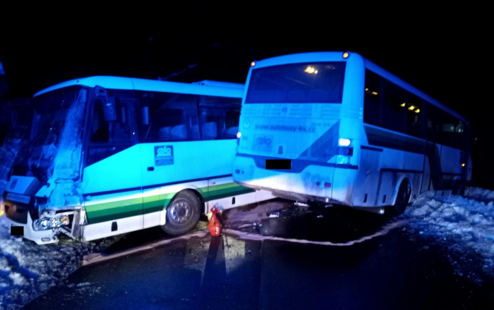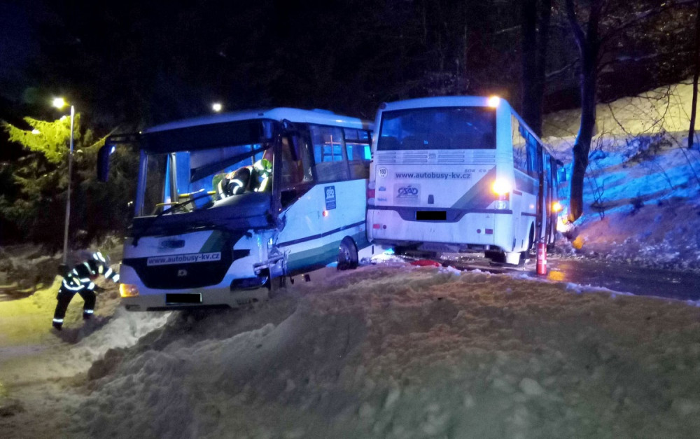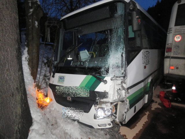 Dva linkové autobusy se srazily na namrzlé vozovce, jeden z řidičů je zraněný