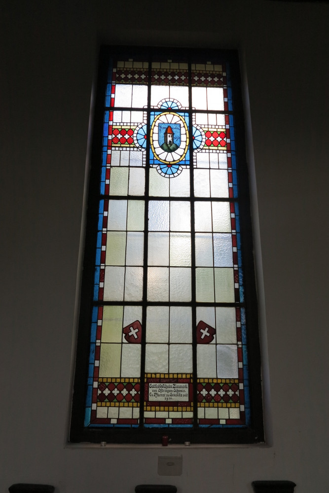Evangelický kostel s farou, Kraslice, vitrážové okno věnované faráři Zimmerlimu