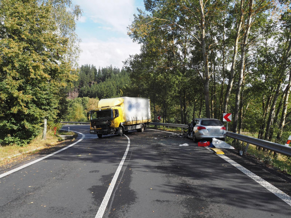 Řidič kamionu dostal smyk a vjel do protisměru. Tam se srazil s osobním autem