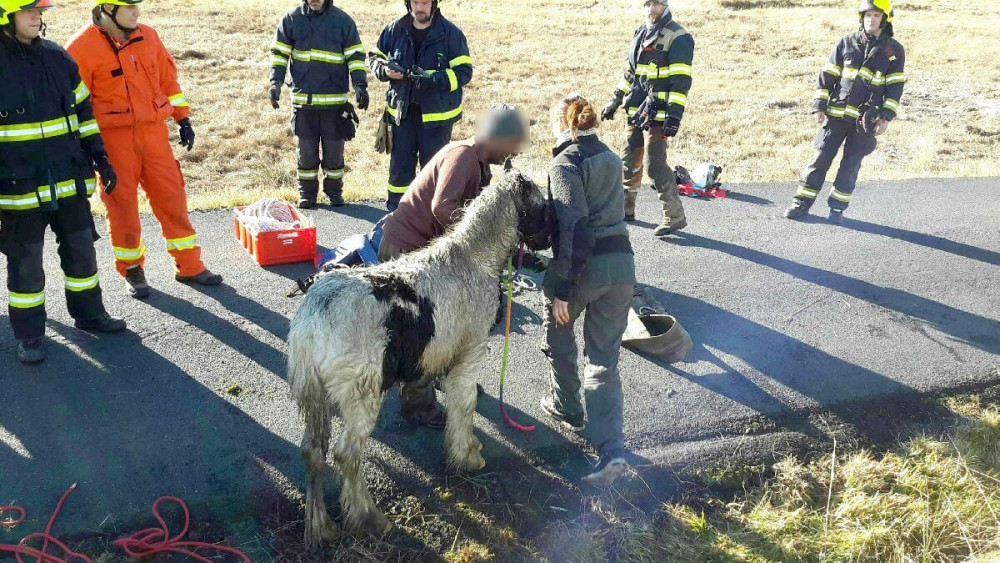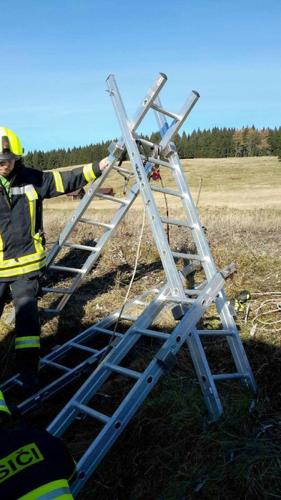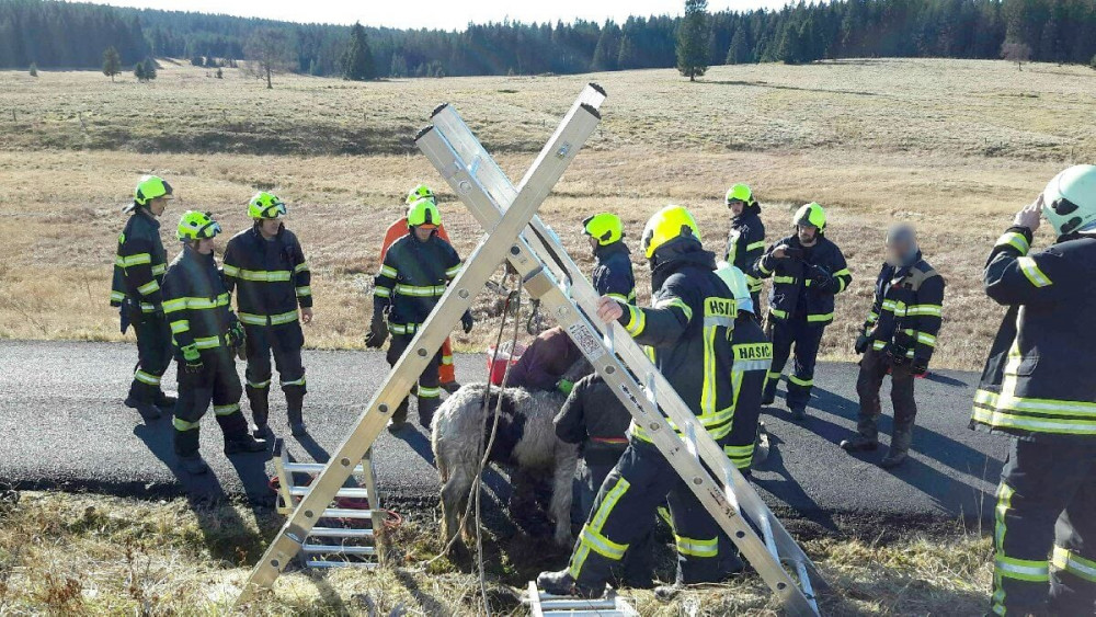 Velká záchranná akce v Krušných horách, do hluboké jámy u silnice zapadlo hříbě