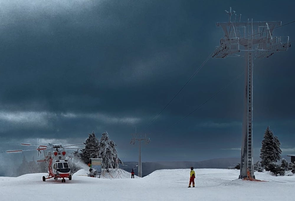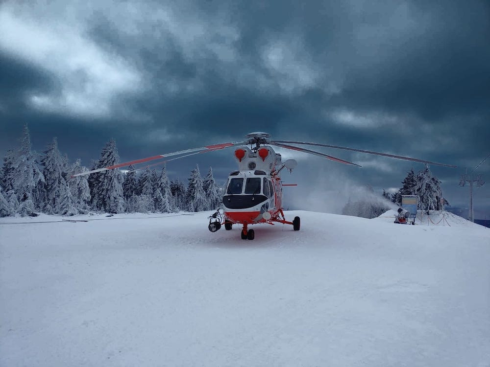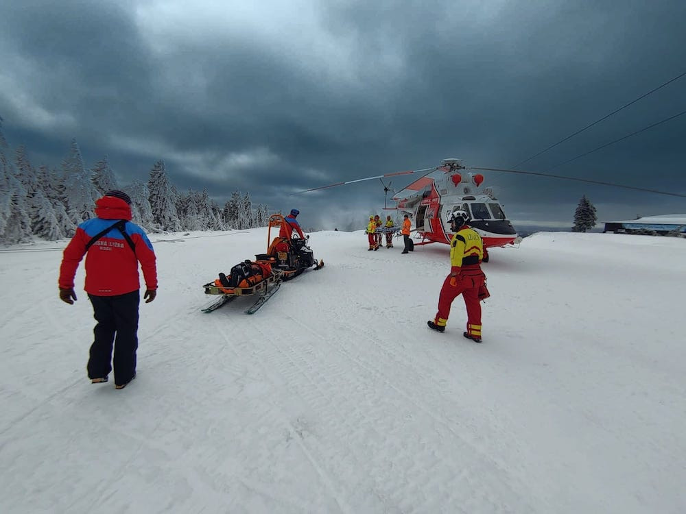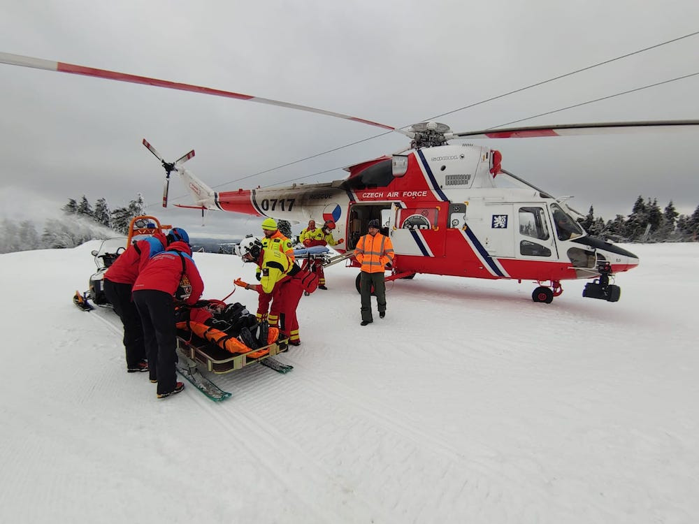 Pro čtyřiašedesátiletého lyžaře musel letět na Klínovec vrtulník. Neměl helmu