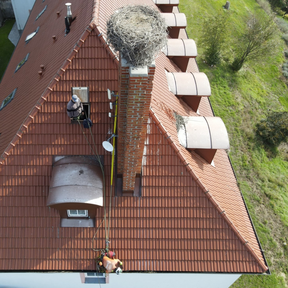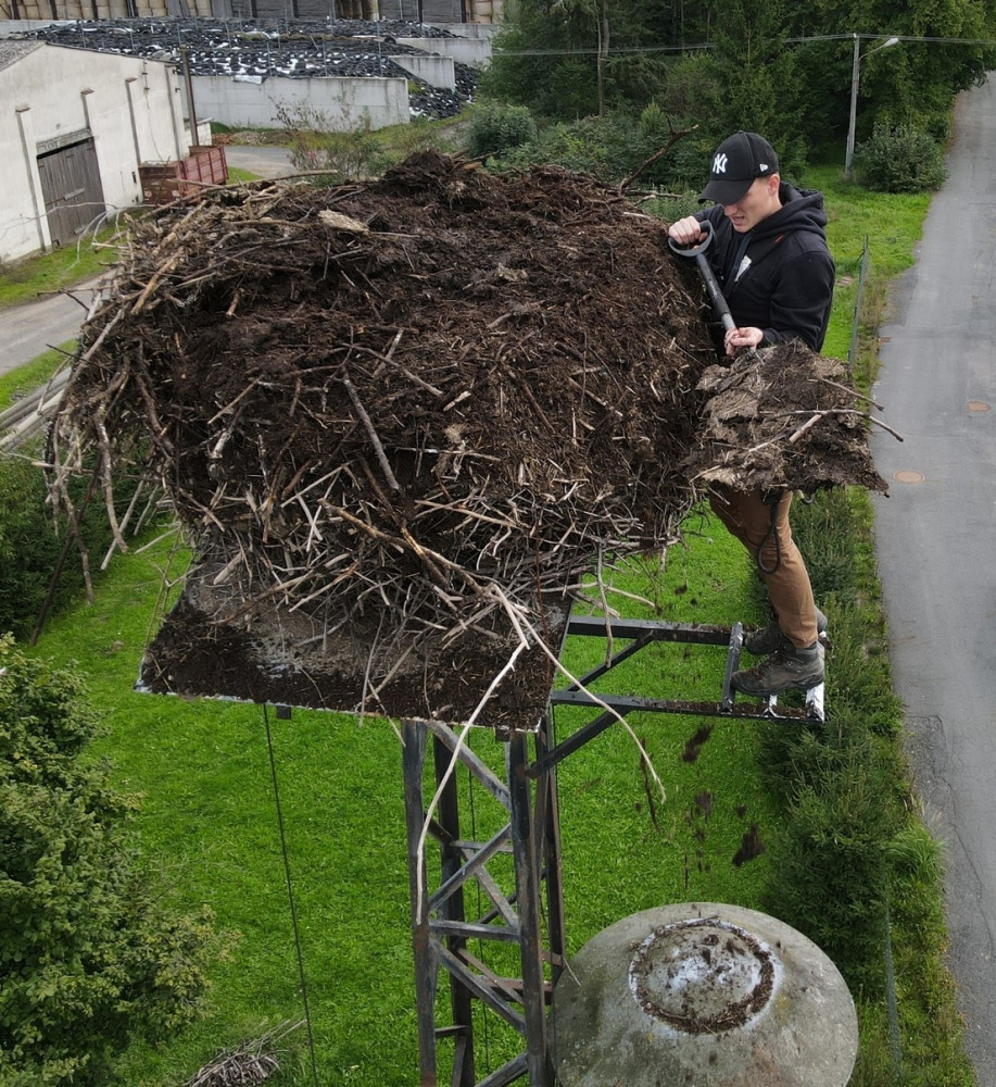 Čápi odletěli do teplých krajin, ve výškách začíná sezóna náročné údržby a čištění jejich opuštěných hnízd.