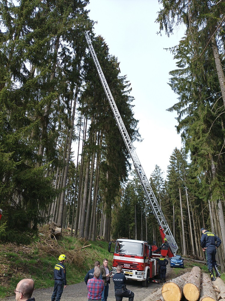Hnízdo bylo ve výšce 35 metrů. Při jeho prohlídce proto asistovali hasiči s výsuvným žebříkem. Foto: Pavla Tájková