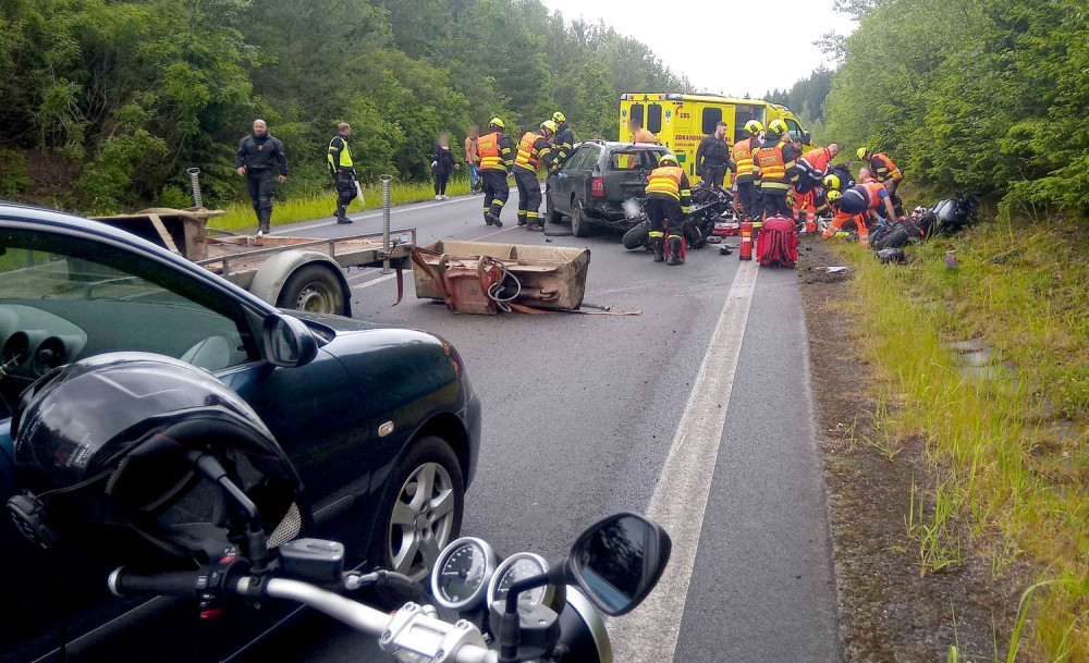 Při nehodě tří motorek a auta zemřel motorkář, další dva jsou těžce zranění