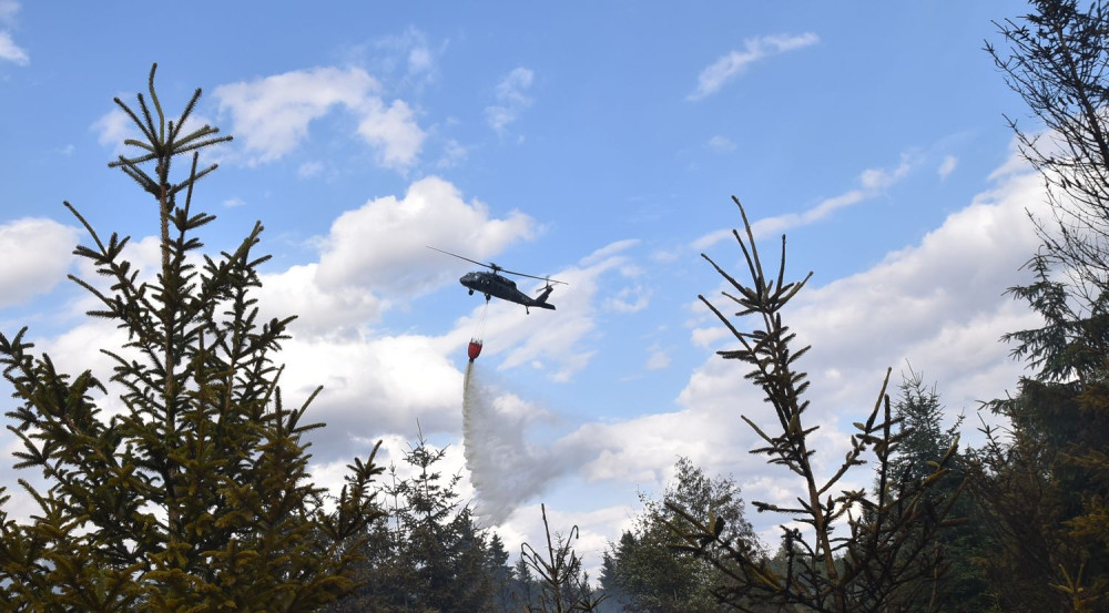 Hasiči bojovali až do večera s požárem lesa, ze vzduchu jim pomáhal Černý jestřáb shazováním vody