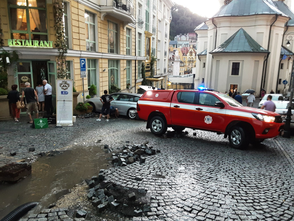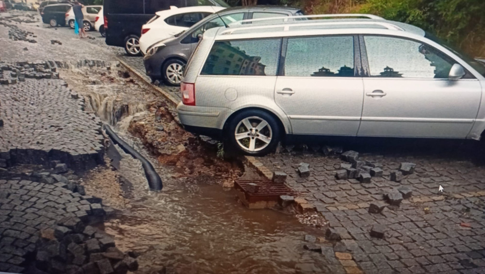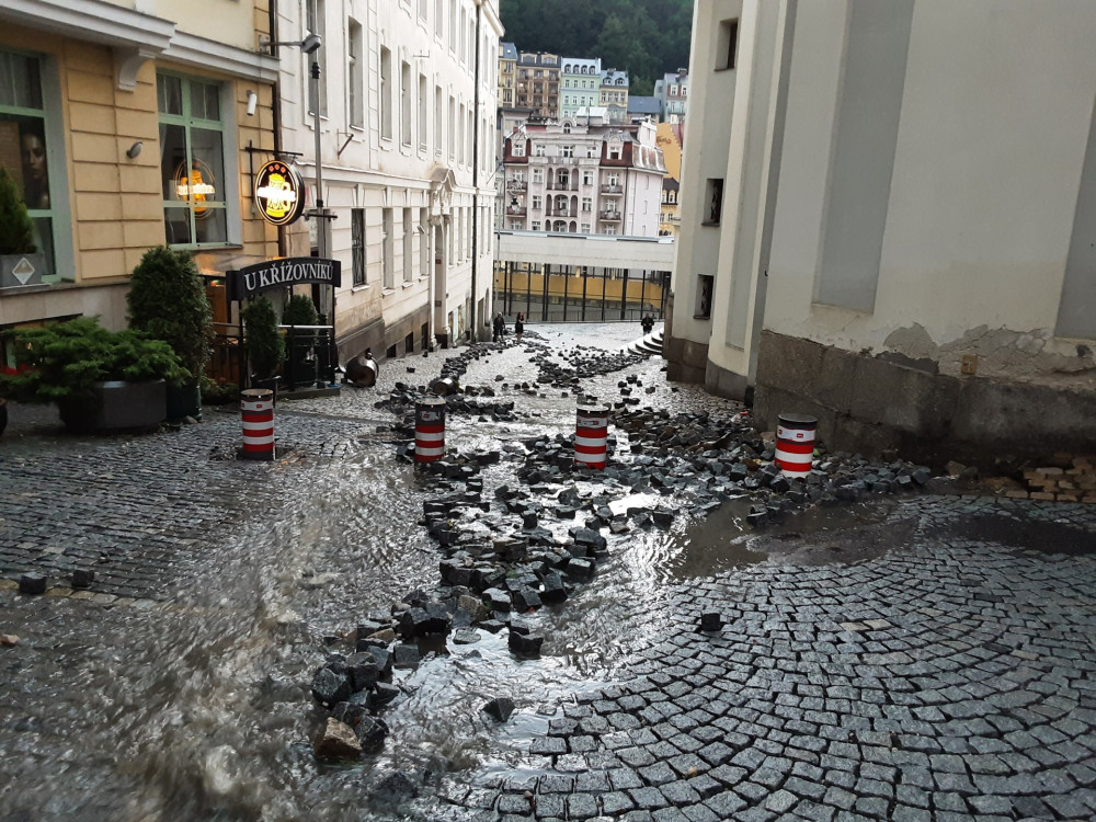Prudký déšť poškodil dlažbu v nedávno rekonstruované Moravské ulici v Karlových Varech