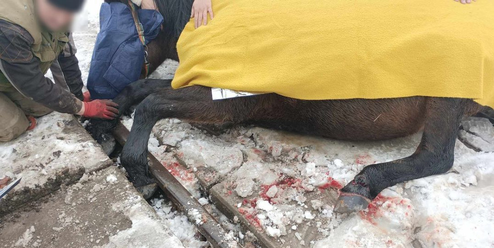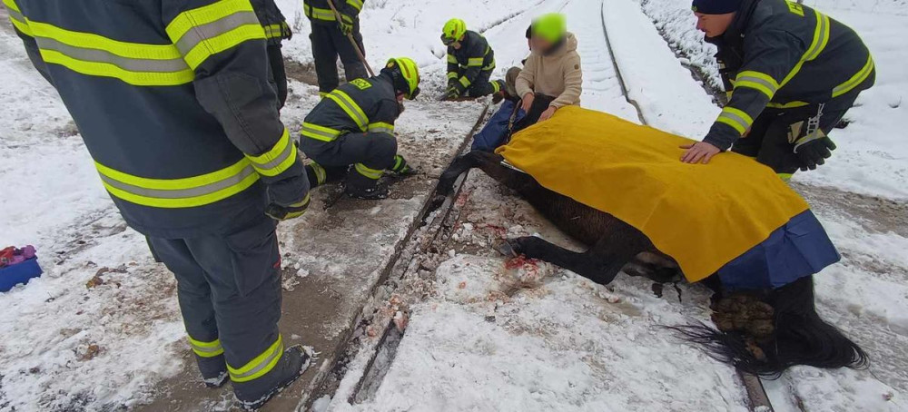 Kůň se zaklínil předními kopyty mezi koleje a betonový nájezd, na místo zamířili hasiči i veterinář