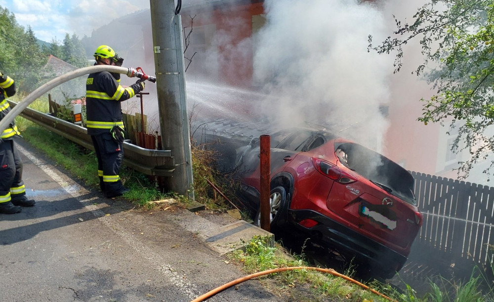 Auto na Sokolovsku začalo po nárazu hořet. Řidička stihla vystoupit