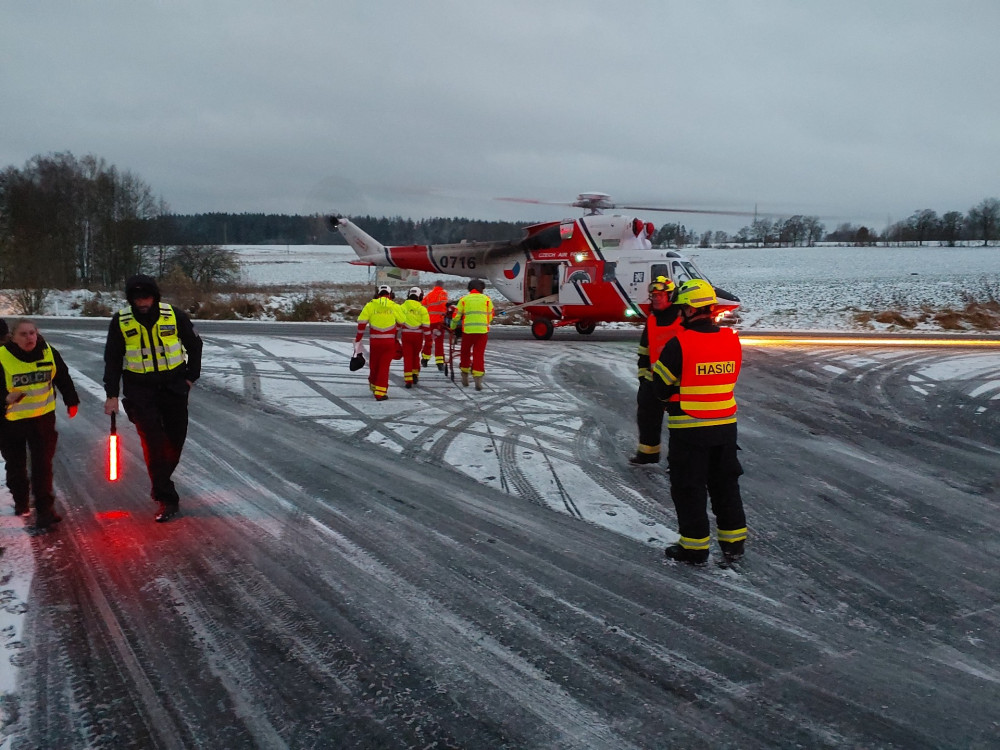 Auto dostalo na kluzké vozovce smyk a přimáčklo k dalšímu vozu chodkyni. Žena utrpěla těžké zranění