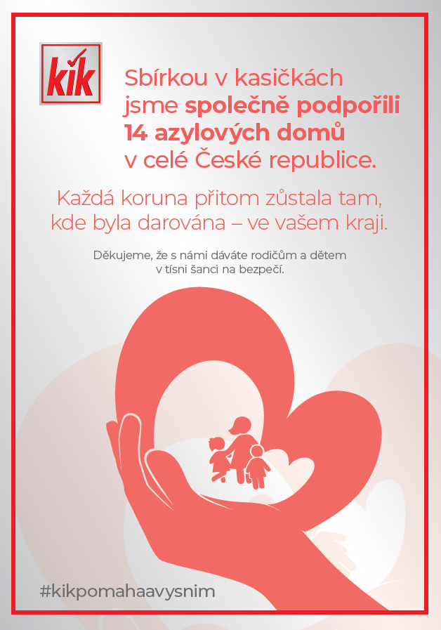 Zákaznická sbírka KiK probíhala ve více než 240 prodejnách po celé České republice. Výtěžek z každého kraje nyní pomůže konkrétním azylovým domům, které poskytují zázemí rodičům a dětem v těžké životní situaci. „V rámci kampaně obdarujeme celkem 14 azylových domů – z každého kraje Česka jeden. Chceme přispět na jejich každodenní práci a konkrétní potřeby, aby mohly poskytovat bezpečné zázemí rodičům a dětem v nouzi,“ dodává Martin Šatný, jednatel společnosti KiK v Česku a na Slovensku.